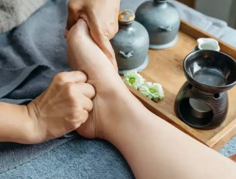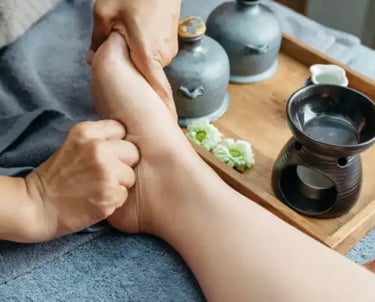Foot Massage manipulates the feet, but refreshes the entire being, body and mind. The client's feet soak in warm-to-hot water with salt for some minutes. Then, the feet are massaged carefully, using oil, cream, and Thai Balm if desired. The last 10 minutes or so are used to massage the shoulders, neck, or head, as desired.